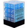 Thirty Six plastic Aqua Cirrus 12mm 6-sided Dice. Cirrus dice are a clear/translucent dice with swirls of unique white embedded throughout. These dice are Aqua and have Silver pips.