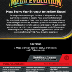 Striving to become stronger, Pokémon of all types are putting everything on the line to become Mega Evolution Pokémon ex! Harness the strong aura of Mega Lucario ex, embrace the overflowing power of Mega Gardevoir ex, and team up with more of these powerful Pokémon that boast devastating attacks and massive HP. But consider your strategy carefully—extra power brings extra risks! Choose your Pokémon partners and prepare for the biggest battles you’ve ever seen in the Pokémon TCG: Mega Evolution expansion!